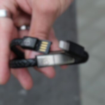 Ett stiligt flätat svart armband i läderimitation med ett spänne i zinc alloy där ena änden har en Lightning-kontakt och den andra en USB-A-kontakt. Armbandet fungerar som en laddningskabel.