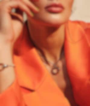 Kort halsband med hänge av 2 sammanlänkade ringar med små stenar.