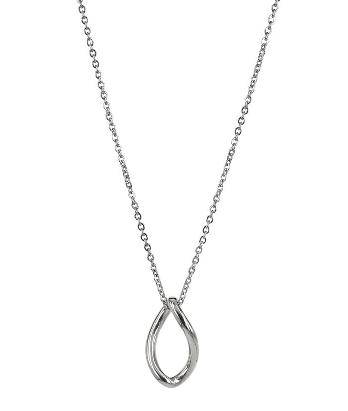 Kort halsband av nätt kedja och hänge i form av en oval, vackert vriden ring i stål.