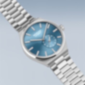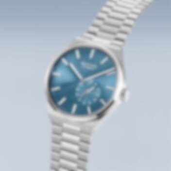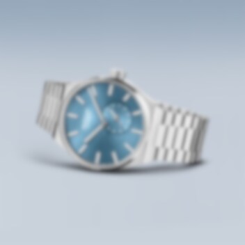 Denna herrklockas boett och länk är tillverkad av rostfritt stål som förkroppsligar BERINGs signatur av sval och minimalistisk stil. Inga detaljer har lämnats åt slumpen vid skapandet av detta designstycke. Herrklockan återspeglar konsten att vara innovativ och konsekvent tidlös i design, vilket BERING är känt för. Urtavlan har BERINGs ikoniska arktiskt blå nyans och är prydd med vita och siilverfärgade index och visare som lyser i mörkret för optimal läsbarhet. Herrklockan har en utsökt detalj - en vit spets på sekundvisaren som ger en touch av kontrast och återspeglar den felfria skönheten i Arktis.