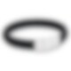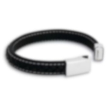 Svart läderarmband med ett magnetlås i stål och snyggt flätat läder som ramas in av vita sömmar.
