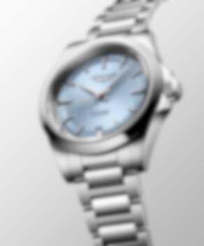 Denna nya Conquest drivs av ett exklusivt Longines självuppdragande mekaniskt urverk. Presenterad i en 34 mm stållåda som är vattentät upp till 10 bar (100 m), den har en snigelfärgad pastellblå solstråleurtavla med rodiumpläterade visare och applicerade rodiumpläterade timmarkörer med Super-LumiNova®-behandling. Datumbländaren är klockan 6. Klockan kommer med ett armband i rostfritt stål.