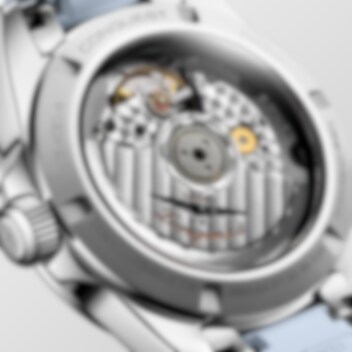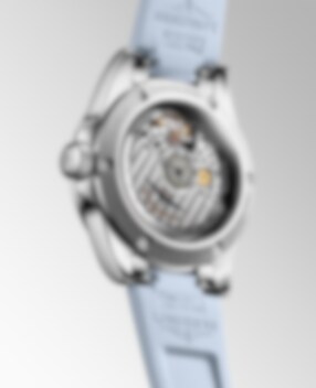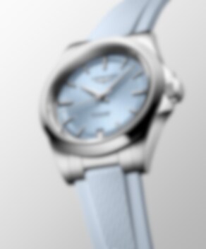 Denna nya Conquest drivs av ett exklusivt Longines självuppdragande mekaniskt urverk. Presenterad i en 34 mm stållåda som är vattentät upp till 10 bar (100 m), den har en snigelfärgad pastellblå solstråleurtavla med rodiumpläterade visare och applicerade rodiumpläterade timmarkörer med Super-LumiNova®-behandling. Datumbländaren är klockan 6. Klockan kommer med ett pastellblått gummiband.