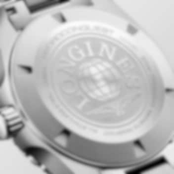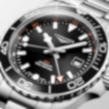 Hydroconquest GMT kommer nu med 43 mm-diameter svart urtavla, med den exklusiva Longines GMT-kalibern L844.5. Den har extrem precision och en gångreserv på upp till 72 timmar. En svart urtavla för solstrålar, enkelriktad roterande ram i svart keramik, vattentäthet till 30 bar (300 meter) och skruvad krona och nedskruvad baksida är signaturen hos denna klocka inspirerad av vattensporternas värld. Modellen kommer med ett armband i rostfritt stål.