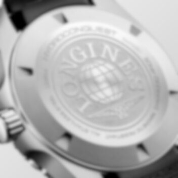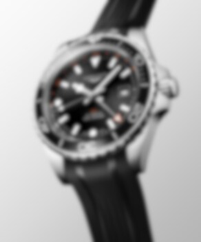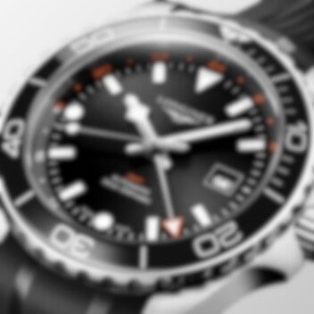 Hydroconquest GMT kommer nu med 43 mm-diameter svart urtavla, med den exklusiva Longines GMT-kalibern L844.5. Den har extrem precision och en gångreserv på upp till 72 timmar. En svart urtavla för solstrålar, enkelriktad roterande ram i svart keramik, vattentäthet till 30 bar (300 meter) och skruvad krona och nedskruvad baksida är signaturen hos denna klocka inspirerad av vattensporternas värld. Modellen kommer med en svart gummirem.