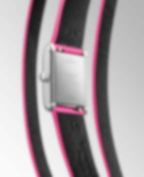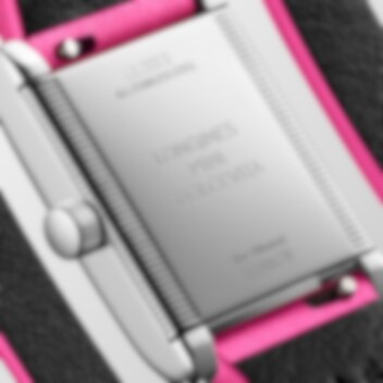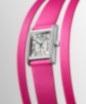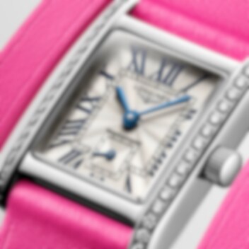 Mini DolceVita är förstärkt med nya läderremmar i en exklusiv Longines-design. Denna pjäs kommer nu i rosa med en rektangulär 21,50 mm x 29,00 mm boett i rostfritt stål och satt med 38 Top Wesselton-diamanter, utrustad med ett högprecisions L178 kvartsverk och är vattentät till 3 bar (30 meter). Denna modell med en försilvrad flinqué romersk urtavla med målade romerska siffror kommer med ett elegant dubbelt tour-band i rosa nappaläder med ett tungspänne i stål.