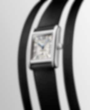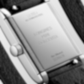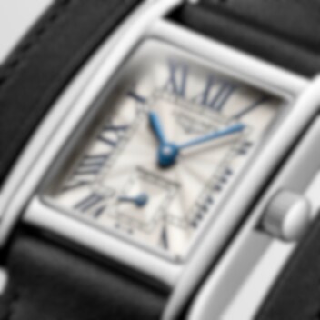 Mini DolceVita är förstärkt med nya läderremmar i en exklusiv Longines-design. Denna del kommer nu i svart med ett rektangulärt 21,50 mm x 29,00 mm hölje i rostfritt stål, utrustad med ett högprecisions L178 kvartsverk och är vattentät till 3 bar (30 meter). Denna modell med en försilvrad flinqué romersk urtavla med målade romerska siffror kommer med ett elegant dubbelt tour-band i svart nappaläder med ett tungspänne i stål.