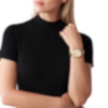 Elegant, detaljrik smyckesklocka i guld smed kronograf och datum. Klockan har vackra detaljer av smyckesstenar både i urtavlan vid samt runt boetten.
