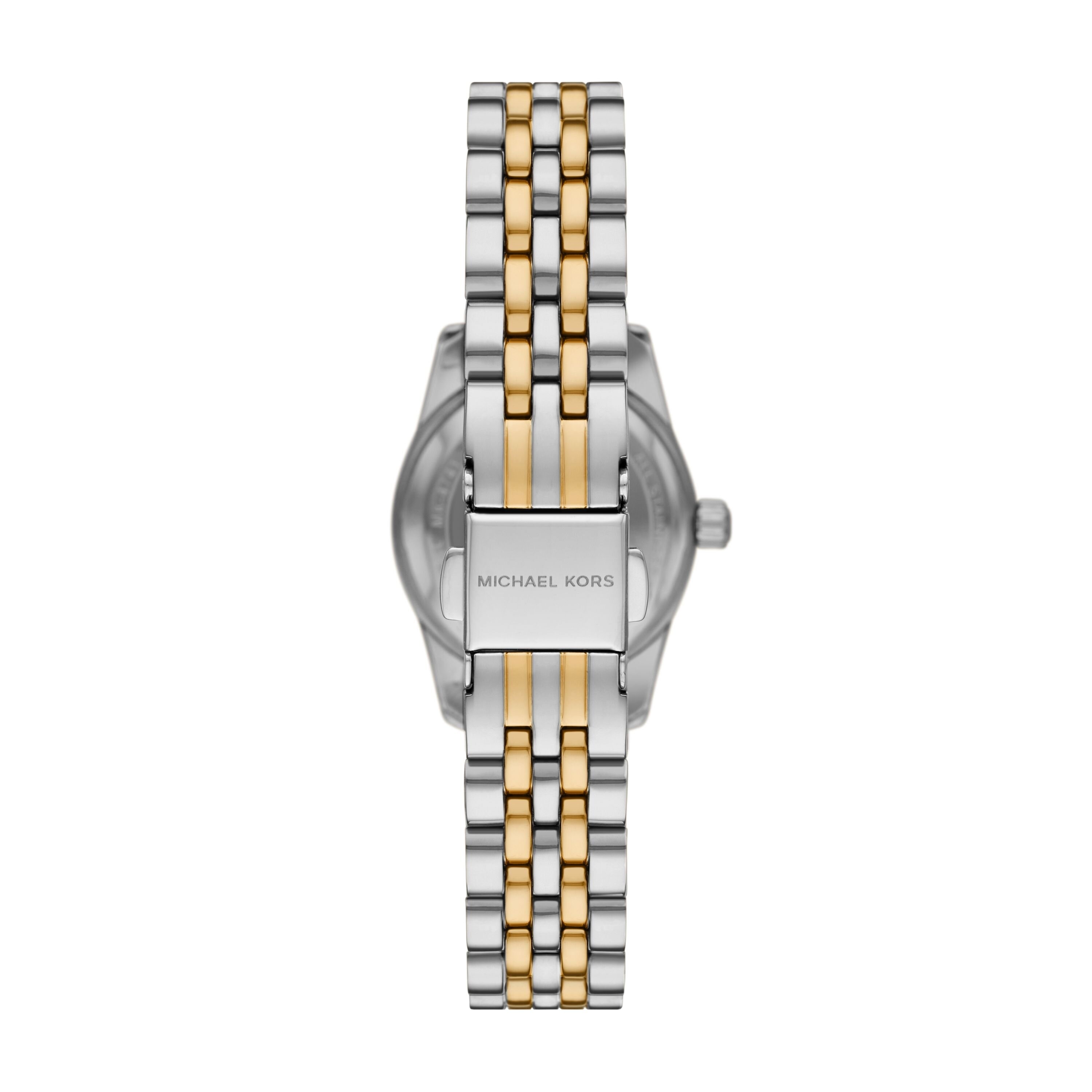 Michael Kors 26 mm Lexington-klocka har en vit urtavla med tre visare och ett tvåfärgat armband av rostfritt stål.