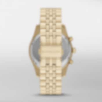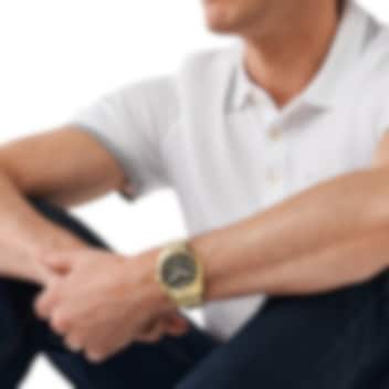 En stor och rejäl herrklocka i guldfärgat stål. Klockan är av sportigare modell med en gedigen boett i 44mm och en detaljerad urtavla med kronograf, datum och romerska siffror.
