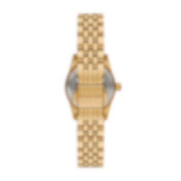 Michael Kors 26 mm Lexington-klocka har en guldurtavla med tre visare och ett armband av rostfritt stål i guldton.