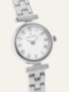 Tidlös med en känsla av historia. Den runda boetten och de romerska siffrorna flirtar med vintage-estetik, medan den vita urtavlan skapar en ljus, modern kontrast.