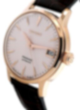 Elegant klocka med ett automatiskt urverk. Boett och skänklar av rostfritt stål med ett roséguldsfärgat utseende, vilket ger klockan en lyxig känsla. Seiko SRP852J1 tillhör Presage-serien, vars klockmodeller är kända för sin sofistikerade design. Klockan använder Seikos egna hardlexglas, ett mineralglas med högre reptålighet än normala mineralglas. Armbandet är av äkta skinn, det bruna lädret passar utmärkt ihop med roséguldsdesignen.