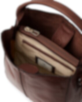Väskan erbjuder välorganiserad förvaring med två invändiga fack som stängs med magnet och ett större fodrat huvudfack. Dessutom finns en ytterficka som stängs med dragkedja för extra säkerhet. De antikt guldfärgade metalldetaljerna ger en sofistikerad touch, och lädret, som är av högsta kvalitet, har bearbetats i ett garveri certifierat av Leather Working Group för en mer hållbar och miljövänlig produktion.