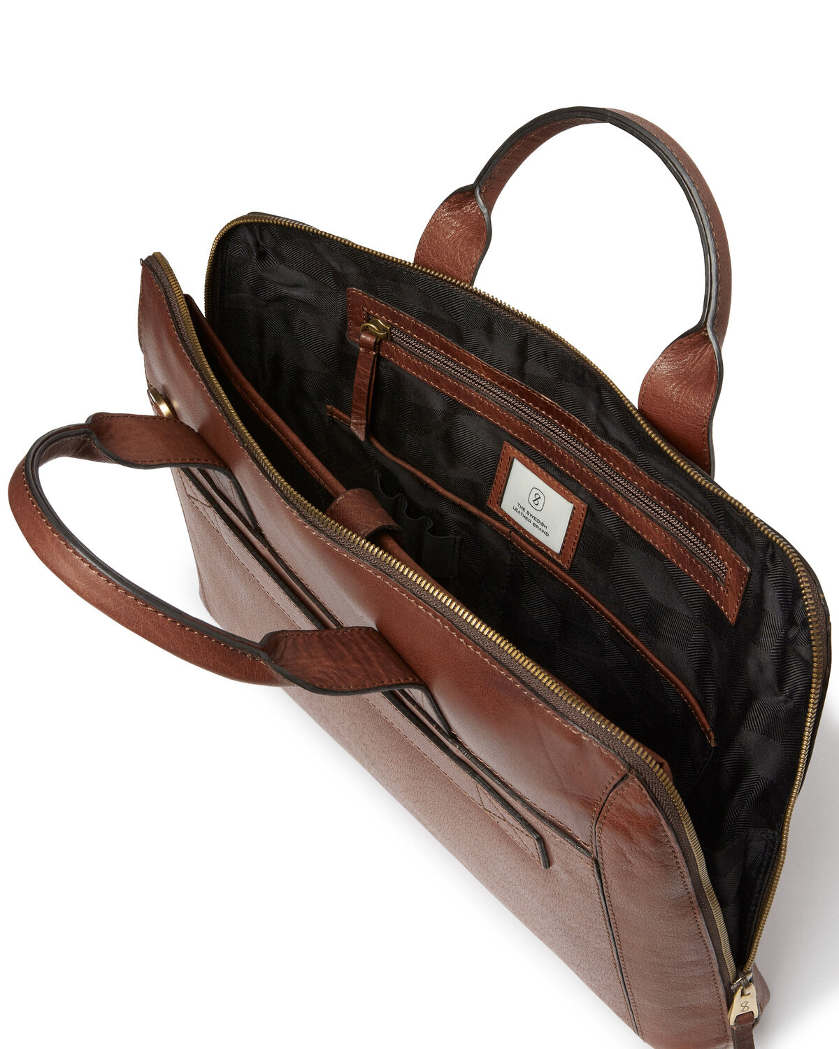 Datorväska Gustav från Saddler är en klassisk och stilren väska tillverkad av högkvalitativt full grain-buffelläder. Det slitstarka lädret får en vacker patina med tiden, vilket ger väskan ännu mer karaktär. Invändigt finns ett vadderat datorfack som rymmer en laptop upp till 15", samt tre praktiska fickor, varav en med dragkedja.