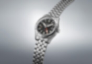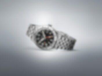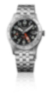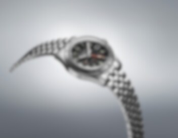 Den framstående femkantiga GMT-visaren i rött förbättrar tydligheten mot den svarta urtavlan.