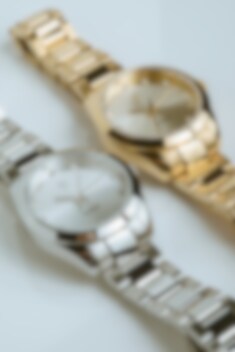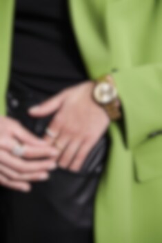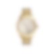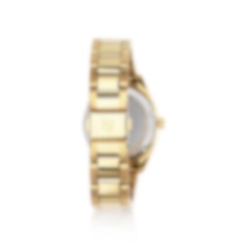 Klocka av guldpläterat rostfritt stål, polerad och borstad yta, med safirglas och vit zirconia i en guld sunray urtavla. Vattenbeständighet 50 m. Urverk: Miyota.