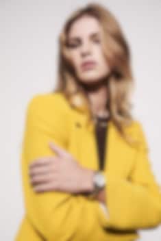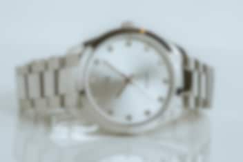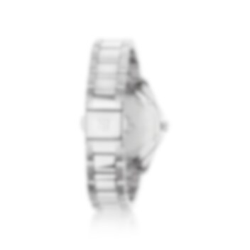 Klocka av rostfritt stål, polerad och borstad yta, med safirglas och vit zirconia i en silver sunray urtavla. Vattenbeständighet 50 m. Urverk: Miyota