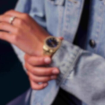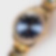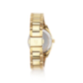 Klocka av guldpläterad rostfritt stål med polerad yta, med safirglas och mörkblå sunray urtavla, dekorerad med vita zirkoner. Vattenressistent upp till 50 m. Urvärk Miyota.