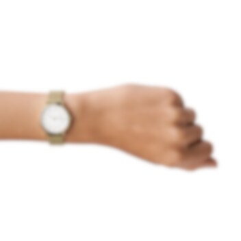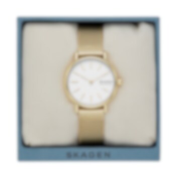Med en minimalistiskt och stilren design återspeglar Skagen Signatur det klassiska formspråk som genomsyrar Skagens klockor. En nätt modell med slimmad meshlänk i guldfärgat stål och en ren urtavlan i vitt utan några överdådiga utsmyckningar. Klockans meshlänk har en ”quick release pin” vilket gör att du enkelt kan byta bandet för att anpassa klockan till varje tillfälle. Enkel och stilren med en modern känsla!