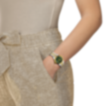 Le Locle-kollektionen introducerades först 2003 för att fira Tissots 150-årsjubileum. Denna klocka är ett stycke historia som förkroppsligar innovationsandan som har definierat vårt varumärke i över ett sekel. Denna modell har en grön urtavle, som ersätter de romerska indexen med tolv skimrande diamanter, och är utrustad med utbytbara snabbutlösande armband. Alla Le Locle-klockor har den vackra clous de Paris "guilloche"-urtavlan i form av små pyramider: en detalj som verkligen gör skillnad. Samspelet mellan polerade och borstade ytor på banan skapar en fängslande visuell rytm som fångar ljuset vid varje rörelse. Denna klocka förkroppsligar charmen av det schweiziska arvet, med namnet "Le Locle" inskrivet i kursiv stil på uravlan, vilket ger designen en sofistikerad touch.