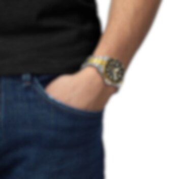 Upptäck den uppdaterade versionen av en av Tissots huvudkollektioner med nya Seastar 40 mm Powermatic 80. Denna nya utgåva har genomgått en subtil förvandling, med en skåra längs kanterna på fodralet, vilket resulterar i ett mer kompakt och sofistikerat utseende. Denna automatiska klocka är den perfekta klockan för dem som letar efter ett sportigt men ändå självsäkert tillbehör, som erbjuder vattentålighet upp till 1000 fot (300 meter) och förbättrad sikt i svaga förhållanden tack vare Super-LumiNova®-belagda visare och timmarkörer. Upptäck den unika estetiken hos denna PVD-version av rostfritt stål och guld med sin svarta urtavla och matchande ram, efter kollektionens signatur sportiga men djärva tilltal.