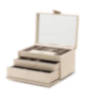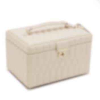 Förkroppsligandet av sofistikering och stil. Caroline Medium Jewelry Case, en tidlös klassiker med eleganta mjuka linjer från 50-talet, smidigt diamantquiltat läder utsmyckat med gulddetaljer. Detta raffinerade fodral är det perfekta hemmet för dina dyrbara smycken och arvegods.